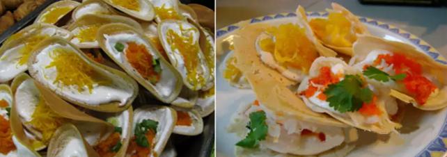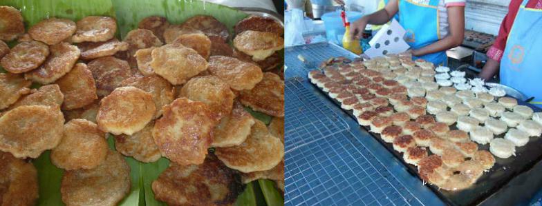 2.蛋黄椰丝小饼(Kha Nom Beung):这道点心在各个集市路边摊都见得到,将面糊烤成一张薄薄的小圆饼,放上椰丝或用蛋黄加糖的蛋丝,并将面皮对折就完成了。