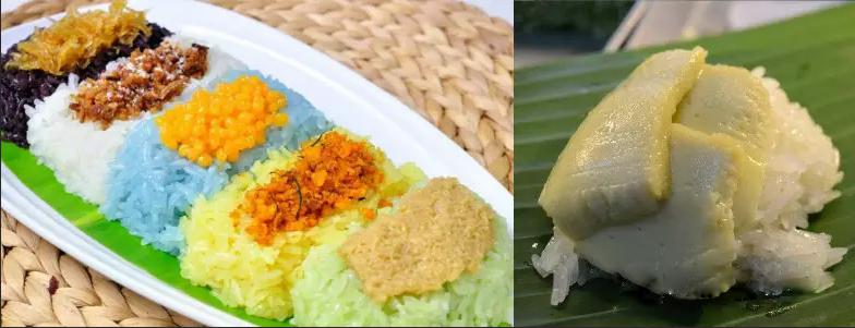 7.黄色米棵(Kha Nom Tien):这道咸点心是用糯米制成的,内馅是猪肉加上一些胡椒,用芭蕉叶或香兰叶包起来蒸熟食用。
