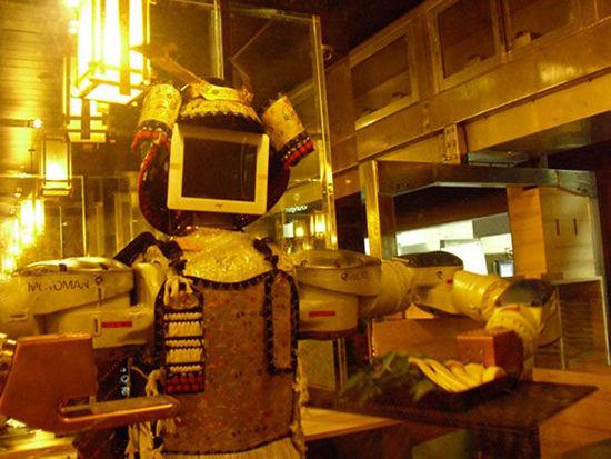 泰国曼谷有一间经营者日本美食,名为‘Hajime’的主题餐厅,该店经营中最大的噱头就在于这些身着日本武士服装的机器人店员。