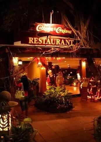 安全套餐厅装饰都以安全套为主题,长廊两侧是与安全套有关的卡通宣传画。时值圣诞,穿过长廊就能见到一棵巨大的圣诞树,上面挂着的礼物都是各式安全套做的。旁边还有憨态可掬的圣诞老人,但帽子、胡子和身上的衣服也是用安全套制作的。整个室外区绿树环绕,其中一角还被开发成“时装展示区”,只不过这些“时装”也是安全套和避孕药丸做成的,经过设计者的奇思妙手变为漂亮的时尚服饰,展示模特还包括好莱坞明星“蜘蛛侠”和“猫女”等大腕。进入餐厅的室内区,就像进入安全套的博物馆。墙壁上都是全球具有代表性的安全套产品的展览。屋顶的吊灯也以安全套作为装饰,闪出不同颜色的光芒。餐桌设计也很独特,桌面玻璃板的图案是由安全套组合完成。做为著名的主题餐厅,此餐厅从创始就肩负着两种职责--提供最好的泰式饭菜和宣传最必要的性保护措施,例如计划生育政策、健康护理和预防艾滋病等。有露天花园座,结账后会送上安全套,餐厅的小卖部也都售卖相关纪念品。菜式经过改良,以适应各国游客的口味,泰式调料的味道都不太浓烈。